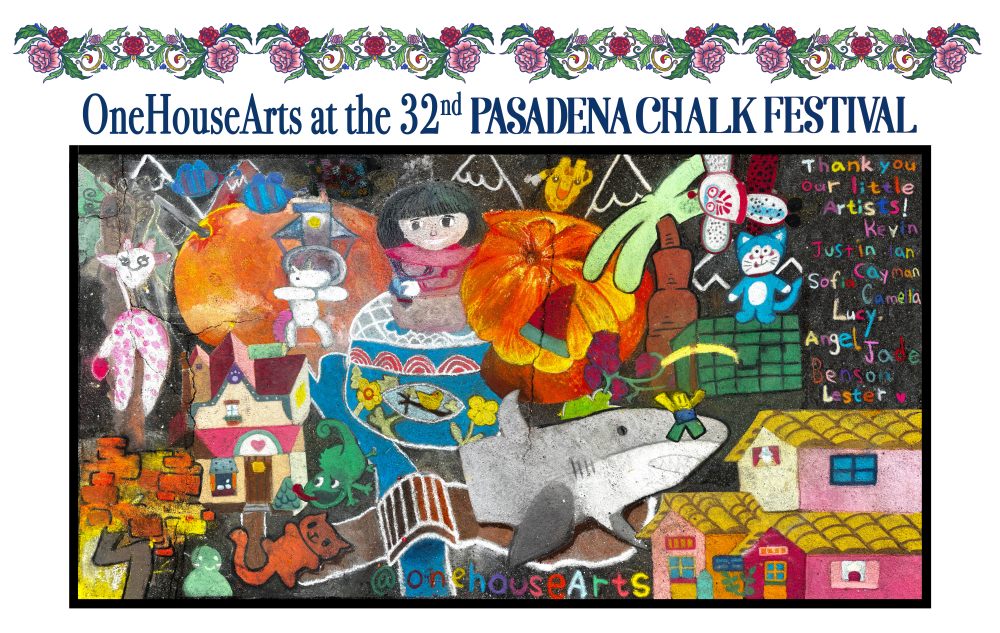 This June, OneHouse Arts joined the 32nd Annual Pasadena Chalk Festival for the third year in a row. Our students and teachers created a playful mural called Cartoon Neighborhood, featuring characters and scenes imagined by the children. Teachers helped combine the drawings into one joyful street mural.